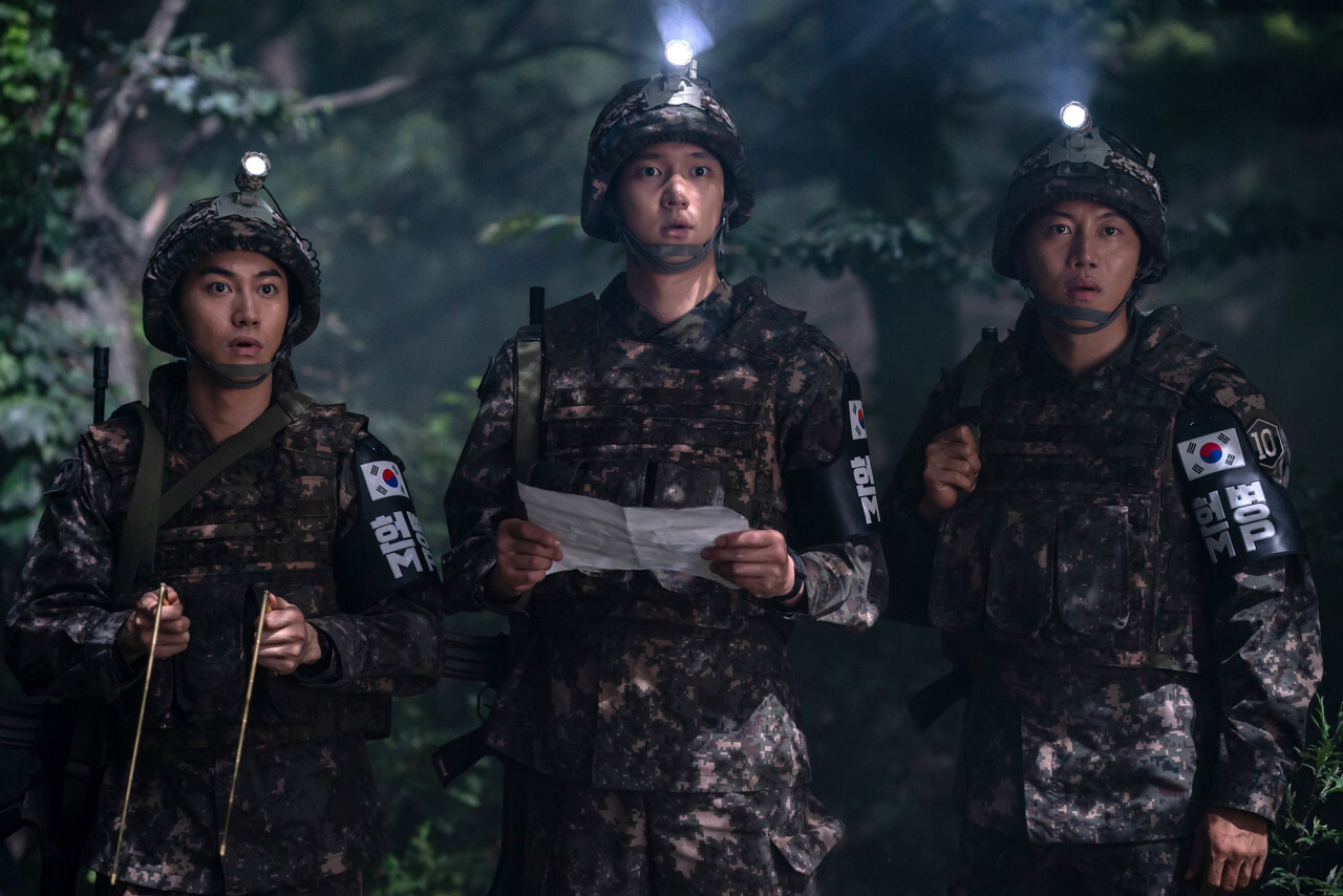 <육사오>는 우연히 1등 당첨 로또를 주운 말년 병장 박천우(고경표)의 실수로 로또가 군사분계선으로 날아가게 되고 이것을 주운 북한 병사 리용호(이이경)가 이를 발견하게 됩니다. 57억을 그대로 날릴 수 없었던 천우는 무단으로 군사 분계선 쪽으로 넘어가게 되고, 그곳에서 잠복 중이던 용호를 만납니다. 한편 당첨금이 57억임을 알게 된 용호는 천우에게 돈을 자신이 9, 천우가 1로 나누자는 터무니없는 제안을 하고, 이를 들은 천우는 반발하는데요! 과연 거금의 로또 당첨금 57억은 누구의 차지가 될까요?